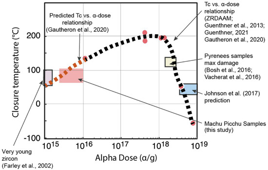 Update of the coevolution of the closure temperature and the α-dose from [18] with our new data from the Machu Picchu profile (red square). Red circles correspond to [15] data recalculated with the density functional theory results (see details in [18]), the yellow box places Pyrenean samples [52,53], and the blue box represents [10] highly damaged zircons. The black dashed line shows the shape of the closure-temperature/α-dose relationship presented in previous models. We added an estimation of the closure-temperature/α-dose relationship inferred from [18] (red dashed line), and the estimated closure temperature of the ZHe from Machu Picchu (this study, red square).