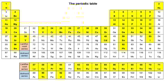 Periodic table of the elements. The elements present in apatite supergroup minerals in the range of ppm to several tenths percent of total weight. The relevant elements are shown in yellow. This figure was prepared originally based on the data from Pan and Fleet [11].