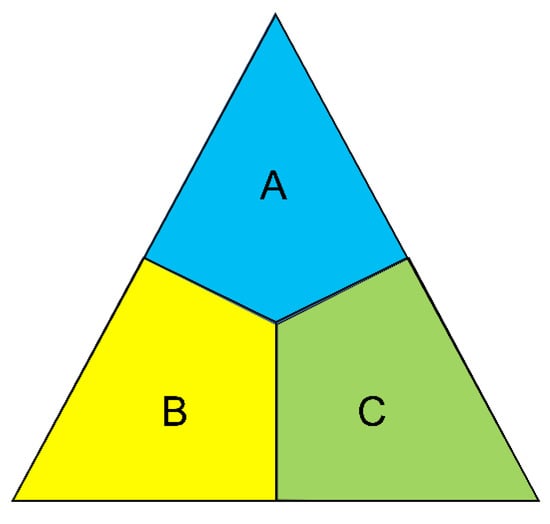 Diagrammatic representation of a complete ternary solid-solution series. A, B, and C represent the three compositional fields, each of which merits a mineral name. Considering apatite as an example, if the three vertices (A, B, and C) are the end components fluorapatite, hydroxyapatite, and chlorapatite, respectively, then by the 50% rule, compositions in the region of A, B, and C are called fluorapatite, hydroxyapatite, and chlorapatite, respectively. In other words, in the OH–F system, the components of Ca10(PO4)6(OH)2 to Ca10(PO4)6(OH, F) are called hydroxyapatite.