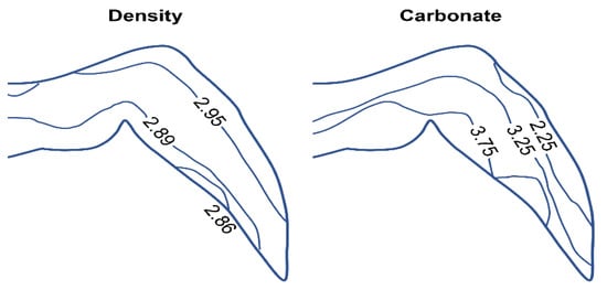 Composition of specific weight and carbonate in enamel of human molars. Comparison between enamel density and variation in carbonate concentration (%) in the same section of enamel. This figure was prepared originally based on the data of Weatherell et al. (1974) [31].