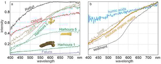 Because a fossil is always unique, non-destructive analyses are usually preferred. Colour is rarely studied, although in some taxa (Conodonts), a “conodont alteration index” has been established to estimate the degree of diagenetic changes []. When the colour of the external surface of bones or teeth is described, it is a visual identification without any measurement [,]. Some attempts have been done to link the colour and the chemical composition [,]. There is a general agreement that black spots are manganese, but chemical analyses are not done in most cases. Colour perception is variable and non-objective because of individual variations in human eyes. Nevertheless, colour can be measured through spectrophotometers []. Such analyses are non-destructive, so that they are used on rare samples. A present-day bone seems to be white, but the profile in the range of the visible wavelengths shows an increase in the red colour (Figure 2a, Rattus): probably remains of haemoglobin. Three bones of the same site are clearly different, whereas two bones from Quercy, France, are similar (Figure 2a) []. The comparison of the colour of the embedding sediment and the surface of the bones show that the slopes of the sediment and the insoluble organic matrix extracted from the bone are similar, but the sediment is darker than the organic matrix (Figure 2b). The colours of the surface and of the organic matrix are almost identical, both materials being less coloured than humic acids. In this site, the colour seems to be of organic origin. There is a paucity of data concerning the colour, so an index has not yet been established.