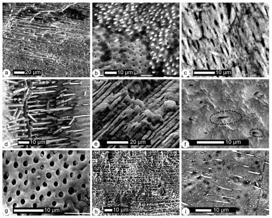 The main part of a mammal tooth is made of dentine, protected by the enamel, and by the bone when the tooth is still inserted in its alveolus. Nevertheless, dentine is rarely intact in fossil teeth. The pattern of parallel tubules in a mammalian tooth still inserted in the mandibular bone is blurred after some years in a soil (Figure 4a). In a single tooth extracted from a present-day regurgitation pellet, two aspects are visible (Figure 4b): some tubules are empty, and some tubules contain remains of odontoblast processes. Fractures in samples found in ancient regurgitation pellets show empty tubules (Figure 4c). Again, a correlation between the geological age of the sample and the quality of preservation does not exist. The tubules of teeth of large mammals are filled (Figure 4d) or empty (Figure 4e,f). The same diversity exists in dinosaur teeth (Figure 4g,h) and fishes (Figure 4i).