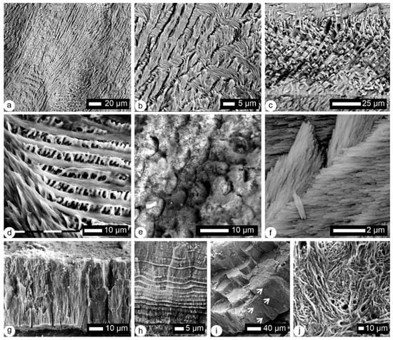 The outer surface of most mammal teeth is enamel, so it is directly exposed to the diagenetic factors. The most surficial nonprismatic enamel layer can be removed after a stage of some years in a soil, so that the prismatic pattern is visible (Figure 5a,b). In a broken rodent tooth extracted from a present-day regurgitation pellet, the prismatic structure is also revealed (Figure 5c). In some fossils, the prismatic pattern is strongly etched, the dissolution depending on the orientation of the prisms (Figure 5d). The key hole pattern of the prismatic structure of a large mammal tooth is not very distinct (Figure 5e), but in another fossil site, the elongated crystallites of the prismatic structure are well-preserved (Figure 5f), although the tooth is broken and cannot be assigned to a taxon. Reptile teeth also show diverse preservation. The inner structure of the ill-defined prisms of some dinosaur teeth can be preserved (Figure 5g), as well as the growth layers (Figure 5h). Nevertheless, in other dinosaur samples, “prisms” have merged in larger structures, still perpendicular to the surface of the tooth (Figure 5i). The outer layer on the cap of durophage fish teeth is a complex arrangement of bundles of fibres that is well preserved in this Jurassic sample (Figure 5j).