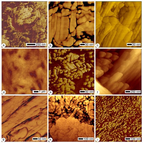 Present-day bone crystals are small, with typical sizes of 50 nm × 25 nm × 3 nm. Their plate-like hexagonal morphology is difficult to observe using classical transmission microscopy [], despite technical improvements. More or less hexagonal tablets are visible using atomic force microscopy (Figure 6a). Nevertheless, the most common aspect is the rod-like shape (Figure 6b). In this sample, crystallites are embedded in an organic matrix (Figure 6b), which is destroyed when the bone is buried for some years (Figure 6c). The smallest osteons are still visible in some fossil bones (Figure 6d), but neither the rod shape nor the platelet shape is preserved (Figure 6e). The prism decussation and the elongated crystallites are preserved in the enamel of a fossil rodent (Figure 6f,g), but not in a fossil large mammal (Figure 6h). Depending on the geological conditions, the organic matrix is more or less destroyed. In the fossil dentine displayed in Figure 6i, dark zones are probably organic remains. Variability of the preservation of organic components has been observed in different taxa [,]. It has also been shown that a tooth with a “well-preserved” prismatic structure is not so well-preserved at a nanoscale [].