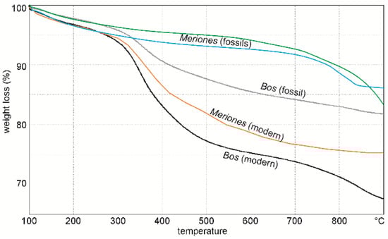 Like all biogenic minerals, bones and teeth are a mixture of organic and mineral components. It is well-known that the ratios of organic and mineral contents differ in enamel, dentine and bone, but most often values are given without any precision. However, mineral and organic components do not have the same density, so the organic/mineral ratios are clearly different when calculated from weight or volume []. For example, the mineral represents 49% of the volume of bone and 70% in weight []. Thermogravimetric analysis (TGA) is a rapid and accurate technique using a few milligrams of sample: it measures weight changes in a material as a function of temperature (or time) under a controlled atmosphere. Organic components are more sensitive to diagenetic alterations: they are a food resource for bacteria and fungi, so in most fossils, the organic-mineral ratio is lower than that of present-day samples. In thermograms, the low organic content of the fossils is apparent in large and small mammal bones (Figure 7) [,]. The ratio can be also estimated from infrared analyses, but TGA is the only direct technique.