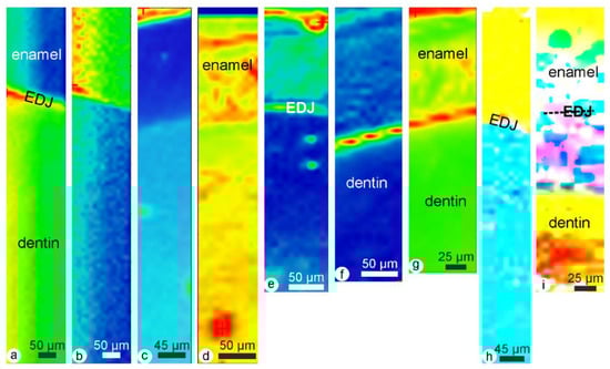 Infrared maps of Meriones incisors. (a,b) Modern tooth. (c) Tooth extracted from a modern regurgitation pellet. (d) Tooth from level I; (e) Tooth from level 3. (f) Tooth from level 7. (g) Tooth from level 8. (h) Ratio of maps between 900 and 1200 cm−1 for the mineral content (PO4) and 1580 and 1720 cm−1 for organic content, for a tooth extracted from a regurgitation pellet (Bubo). (i) Ratio of maps between 900 and 1200 cm−1 for the mineral content (PO4) and 1580 and 1720 cm−1 for organic content, for a tooth from level 3. All levels from El Harhoura 2 cave (Morocco, late Pleistocene—middle Holocene). A 961 cm−1 band (ν4 used to visualize PO4 Distribution; 1238 cm−1 band used to visualize amide III distribution). Abbreviation EDJ: enamel—dentine junction.