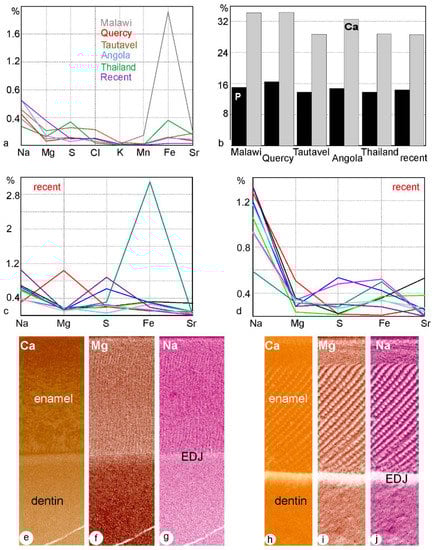 Average elemental composition of modern and fossil bones and teeth (% in weight). (a) Minor element contents of bone of large mammals. (b) Major element contents of the same bones displayed in 10a. (c) Minor element contents of the dentine of reptilian teeth. (d) Minor element contents of the enamel of the same reptilian teeth. (e–g) Distribution maps in a modern rodent incisor. (h–j) Distribution maps in a fossil rodent incisor from El Harhoura 2 cave (Morocco, late Pleistocene—middle Holocene). Abbreviation EDJ: enamel–dentine junction.