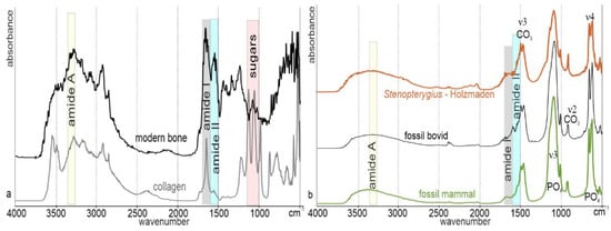 FTIR spectra of insoluble organic matrix from collagen and extracted from a modern bone (Bos) (a) and extracted from fossil bones (b). The insoluble matrix of the modern bone is not pure collagen. Insoluble matrices of fossil bones are not fully demineralized, as shown by CO3 and PO4 bands. Stenopterygius: see also Figure 8b.