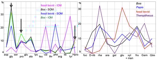 (a) Amino acid composition of a modern and a fossil bovid bone. (Arrows) Amino acids said to be characteristic of collagen []. (b) Monosaccharide composition of the soluble organic matrices extracted from two modern bones and their fossil counterparts. IOM: insoluble organic matrix, SOM: soluble organic matrix.