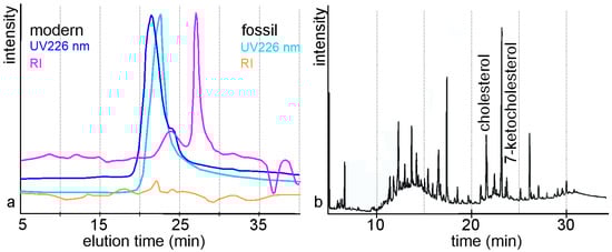 Molecular weights of the soluble organic matrices extracted from fossil bones are often smaller than those of their present-day counterparts [], and using a refractometric detector, it is also visible that sugars are strongly destroyed by diagenesis (Figure 13a). Few data are available on sugars and lipids in bone, and they are quasi-absent for teeth. Using Sudan B black staining, Pawlicki [] has been able to reveal the presence and distribution of lipids in dinosaur bones. Mucopolysaccharides were also revealed in dinosaur bones using diverse staining procedures []. Osteocalcin has been preserved in bovid bones (13 million years old) and rodent teeth (30 million years old) [] and in some dinosaur bones []. Such data can provide clue for evolution. The distribution of lipids and sugars are sometimes similar to that of present-day bones. Acyl lipids are in low concentration in ancient mammals bones of diverse origins and geological age, while the diagenetic degradation of cholesterol is variable [,] (Figure 13b). Some lipids are the results of bacterial activity.