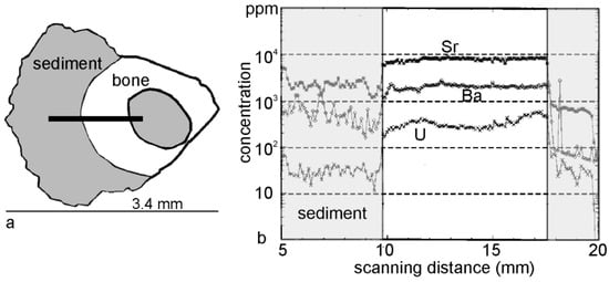 (a) Section showing the locations of the analysed profiles. (b) Ba, Sr and U profiles through the fossil bone from Olduvai, Ngorongoro (Tanzania) shown in Figure 4a. Redrawn from [].