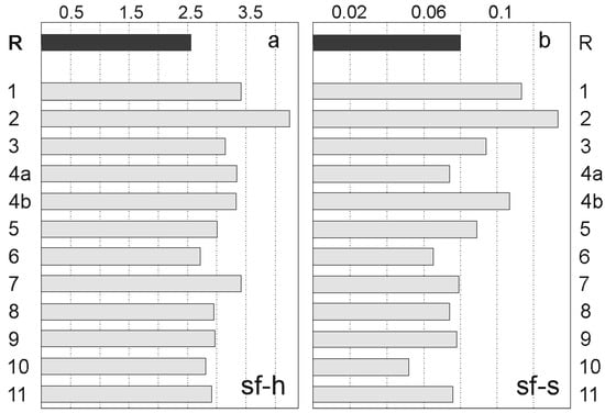 Crystallinity index (=splitting factor): (a) calculated from the band height (sf-h), (b) calculated from surface (sf-s) of the infrared spectra of long bones of Meriones. El Harhoura 2 cave (Morocco, late Pleistocene—middle Holocene). R: recent fresh bone.