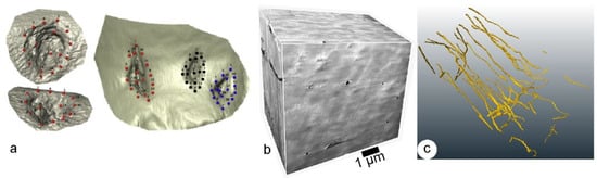 When they are successful in the search of new fossils, palaeontologists and archaeologists take care of their samples. They are carefully cleaned before being studied and stored. Multiple techniques are available, but nondestructive techniques are preferred. A popular nondestructive technique is tomography–µCT scan, but modifications have been noticed []. 3D reconstructions allow surficial marks or shapes to be isolated and differentiated for an easier comparison [,]. CTscan also allows researchers to reveal the inner structure of samples submitted to experimental diagenesis [,]. The current tendency is to combine the acquisition of several parameters on a single specimen. Ideally, acquisitions are simultaneous. CTscan is not the only technique used to collect 3D reconstructions. For FIB SEM (Focused Ion Beam Scanning Electron Microscopy) the ion beam etched the surface of the sample which is scanned for picture. For FIB SEM tomography, the process is repeated, and 3D reconstructions are done. Such data are mainly of interest for porous or heterogeneous samples [,]. Size and shapes of lacunae and canals in modern and fossil bone and teeth can be compared and inner modifications detected (Figure 16). Chemical composition of the FIB section is obtained by EDS analyses.