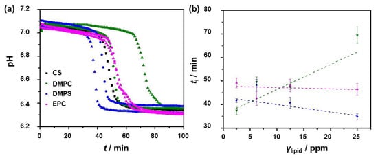 The solid phase appeared in the control system immediately after mixing the reactants, and pH decreased from about 8.15 to about 6.80 in less than 10 min. Similar behavior of the precipitation system was noted when liposomes were added, thus indicating no significant influence on the induction time and progress of the precipitation process in the case of all EPC and DMPC concentrations and the case of lower DMPS concentrations (Figure S6). Representative pH vs. time curves obtained during CaCO3 precipitation in the presence of the highest applied lipid concentration, γ (lipid) = 25.0 ppm, are shown in Figure 5. For comparison, the progress curve of the control experiments, without the addition of liposomes, is also shown. It is obvious that the addition of EPC and DMPC did not significantly affect CaCO3 precipitation, while the addition of 25 ppm DMPS caused the termination of the process at a somewhat higher pH value compared to the control system (Figure 5). The likely explanation for the observed retardation of crystal growth is liposomes’ adsorption on the crystal surface.