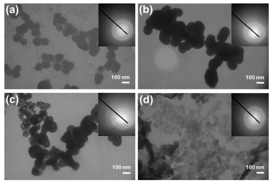 Precipitates were initially characterized by TEM after 30 min of reaction due to the small amount of formed precipitate (Figure 2). In all investigated systems, selected area electron diffraction (SAED) patterns showed the presence of an amorphous phase. In the control system, as well as in the presence of DMPC and DMPS liposomes, typical chain-like aggregates of spherical ACP particles were observed [52,62,65,73]. However, the sizes of small spherical particles obtained in the presence of specific liposomes were different. Particles with the smallest average diameter (79.1 ± 10.9 nm) and with a narrow size distribution (Figure S5) were obtained in the control system, while those formed in the presence of DMPC liposomes were larger (127.0 ± 17.5 nm) and somewhat elongated. Similarly, in the presence of DMPS, the particles were elongated, but their size distribution was wider, ranging from 60 to 180 nm with an average size of 110.8 ± 21.2 nm. However, completely different ACP morphology was noted in the EPC liposomal systems, in which a gel-like precipitate was obtained [74].