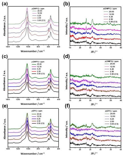 FTIR spectra (a,c,e) and PXRD patterns (b,d,f) of the CaP precipitate formed after 60 min of aging in the absence (CS) and presence of different concentrations of liposomes (expressed as lipid concentration): (a,b) DMPC, (c,d) DMPS, and (e,f) EPC. ci (Ca) = ci (PO4) = 3.5 mmol dm−3; pHi = 7.4; ϑ/°C = 25 ± 0.1.