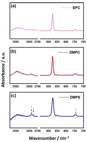 FTIR spectra of vaterite formed after 10 min of aging time in systems with the presence of different liposomes: (a) EPC, (b) DMPC, and (c) DMPS; ci (Ca) = ci (CO3) = 20 mmol dm−3; γ (lipid) = 25.0 ppm; pHi = 8.15; ϑ/°C = 25 ± 0.1. Arrows: characteristic absorbance band of vaterite, 746 cm−1, and characteristic CH2 stretching modes of liposome, 2851 cm−1 and 2912 cm−1.