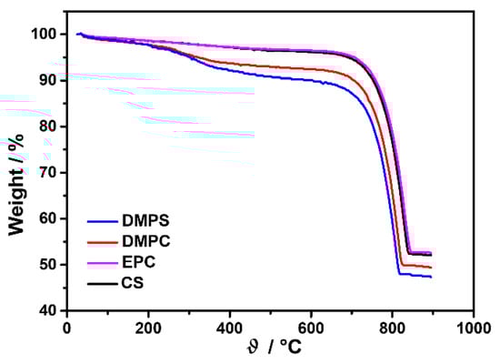 The content of organic material in vaterite samples was estimated by conducting thermogravimetric analysis. It was found that the decomposition of samples prepared in the presence of liposomes occurred in two steps, while for the sample prepared in the absence of liposomes, only one decomposition step was observed. Thus, Figure 8 shows TGA curves of samples prepared in the presence of the highest concentration of different liposomes: the weight loss in the temperature range between 200 and 500 °C corresponds to the decomposition of liposomes, while the decomposition of CaCO3 to CaO and CO2 occurs at about 800 °C. It was found that the TG curve of the sample isolated from the system with the addition of EPC shows no significant changes compared to the TG curve of the control system. However, a mass loss at about 350 °C was observed in the case of samples prepared in the presence of DMPC and DMPS liposomes. The estimated maximum value of organic content in those samples was 7.2% for the DMPC sample and 9.7% for the DMPS sample. The results are consistent with the respective FTIR analysis and confirm the presence of DMPC or DMPS in the vaterite crystals. Previous studies reported the incorporation of organic species in biomimetic calcite and vaterite [84,85,86], while a much higher lipid content, about 30%, was detected in amorphous calcium carbonate particles [87]. Gopal and co-workers reported the synthesis of calcium carbonate microparticles with phospholipids entrapped (2.5–5.0%) in the porous vaterite structure, resulting in an organic/inorganic complex matrix [45]. Their TG analysis revealed that calcium carbonate and phospholipids in these microparticles exhibit strong interactions.