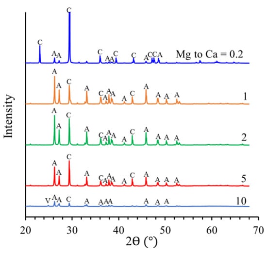 Selected XRD patterns of the precipitated solids are shown in Figure 2. The quantitative analyses of the calcium carbonate polymorphs are presented in Table 2. At the lowest Mg to Ca ratio (i.e., 0.2), Mg-calcite is the dominant precipitated solid phase (75–83%), with 17–25% of aragonite and no characteristic peaks of the other phases. At higher Mg to Ca ratios (>0.2), an obvious change in the mineralogy of the precipitated solids was observed. The X-ray diffraction patterns showed that the precipitated solids comprised 4 to 5% Mg-calcite and 95 to 96% aragonite. At the highest Mg to Ca ratio (i.e., 10), the diffraction patterns showed 2 to 3% Mg-calcite, 64–85% aragonite, and 13–34% vaterite. These data imply that Mg to Ca ratios >0.2 prevent Mg-calcite formation, and that aragonite precipitation is preferred. At the highest Mg to Ca ratio, even vaterite remains stable over 7 days. The XRD patterns also indicate that pH has no significant effect on the composition with respect to crystalline polymorphs.
