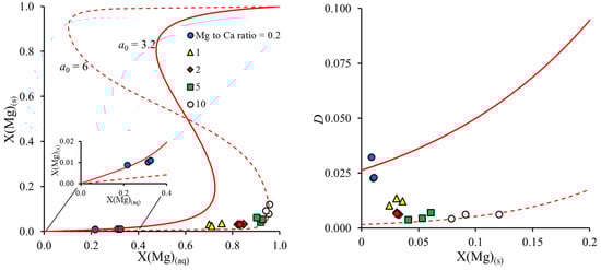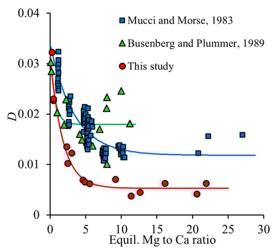 Since it is not possible to capture the dependence of D on the Mg to Ca ratio in a solution by a simple thermodynamic model, we derived the parameters for an empirical relation in the form of Equation (16) to describe the dependence of D on the solution composition.