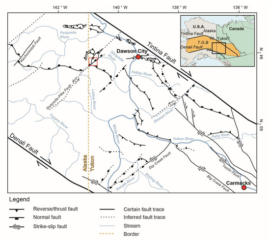 Regional structures in the Alaska-Yukon region (modified after Allan et al., 2013) [8]. Inset map shows the location of the Tintina Gold Belt (T.G.B.). The study area (red box) is located close to the Alaska–Yukon border and lies within an area interpreted as a pull-apart basin resulting from left stepover on the left-lateral Sixtymile-Pika Fault.
