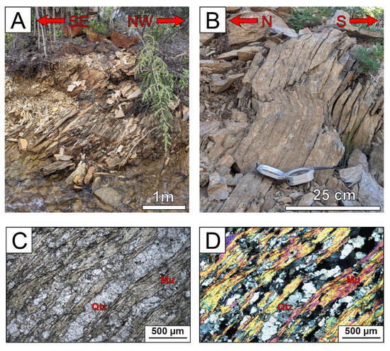 Examples of foliation in the study area. (A) Moderately SE-dipping foliation of Nasina Schists, which belong to the Upper Devonian to Mississippian Finlayson Group (DMF3) along the Bedrock Creek. (B) Steeply NE-dipping foliation of lighter-colored schists that belong to the Upper Devonian to Mississippian Finlayson Group (DMF1) in the Sixtymile River area. Refer to Figure 2 for location. (C) Plane polarized light thin section view of a sample from the Middle to Late Permian Klondike Schist (PK2), a strongly foliated, fine- to coarse-grained muscovite quartz schist (Sample DDH-11-15-3, 224.90 m–233.33 m; see Supplementary Figures S1, S3 and S12E for sample location maps and a hand specimen image). Alternating layers of mica and quartz crystals with an evident preferred orientation can be observed. (D) Cross-polarized light view. Qtz—quartz, Mu—muscovite.