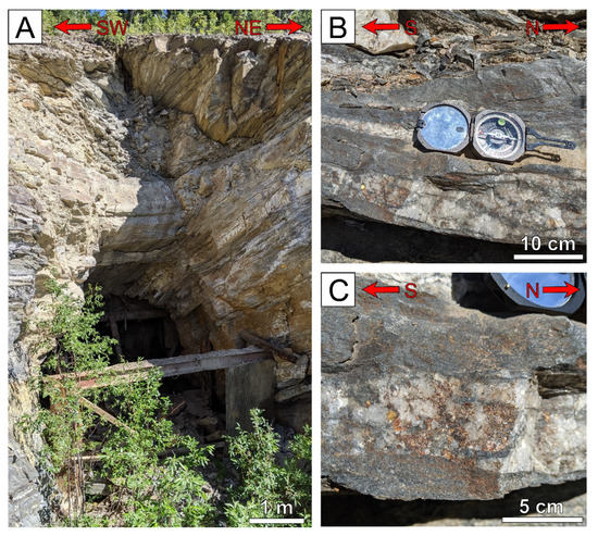 Foliation-parallel veins and boudins in the NW–SE-striking, NW-dipping Nasina Schists, which belong to the Upper Devonian to Mississippian Finlayson Group (DMF3). (A) Abandoned adit which cuts through the Nasina schists in the Miller Creek area. (B,C) Disseminated sulfide mineralization can be observed in lens-shaped and boudinage quartz veins. Refer to Figure 2 for location.