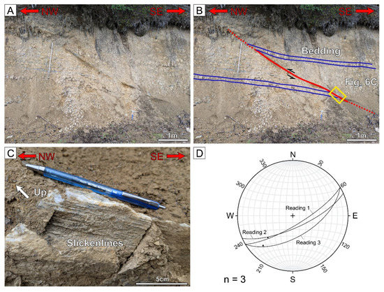Close-up view of the gouge and slickenlines on the nearly N–S-striking strike-slip fault south of the Sixtymile river shown in Figure 8. (A) Uninterpreted outcrop photo. (B) Interpreted outcrop photo. (C) A blown-up image showing the slickensided fault plane and fault gouge. The location of this image is indicated by the yellow box in (B). Refer to Figure 2 for location. (D) Stereographic projections of fault planes and lineations of the strike-slip fault in the Sixtymile River area. Structural readings for this strike-slip fault are listed in Table 1 as “SS1, SS2”.