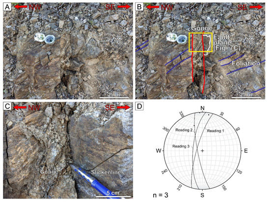 Foliation, ranging from slaty cleavage to schistosity (Figure 3A,B), is defined by the alignment of micas (Figure 3C,D; muscovite, and less commonly biotite), and is associated with foliation-parallel lens-shaped and/or boudinage quartz veins that occasionally display sulfide mineralization (Figure 4). Foliation was mainly observed in the Nasina Schists of DMF3, and the light-colored schists of DMF1. Fractures affect all units (Figure 5) and exhibit dominant trends in certain localities. Veins are associated with foliation, but are also found along fractures and fault planes (Figure 5 and Figure 6). Outcrops with faults were limited in the Sixtymile mining district, with only two unequivocal faults identified in this study: (1) A NE–SW-striking, steeply SE-dipping oblique reverse fault along the Sixtymile road (Figure 6, Table 1; star labeled ‘Figure 6’ in Figure 2); and (2) a nearly N–S striking, steeply dipping strike-slip fault in the Sixtymile River area (Figure 7, Table 1; star labeled ‘Figure 7’ in Figure 2).