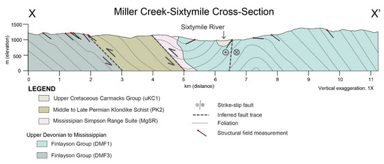 We illustrate the major structural features and the stratigraphic relations of most of the units in a geologic cross-section which runs NW–SE along Miller creek (Figure 8). The cross-section through the Miller Creek in the Sixtymile mining district shows E-dipping basement rocks (Figure 8), including DMF3 and PK2, that are stacked against each other along a top-to-the-NW reverse fault contact (Figure 8). This fault was first documented by Mortensen (1996) [43] and is reflected in the maps of the Yukon Geological Survey (2020) [23]. This reverse fault is shown on the geologic map (Figure 2) as being reactivated along some segments by normal faulting resulting from localized extension related to the left-stepover of the left-lateral Sixtymile-Pika Fault in the area. Further east, the extensively folded Upper Devonian to Mississippian Finlayson Group intermediate to mafic volcanic and volcaniclastic rocks, and fine-grained amphibolite and greenstone (DMF1) is in thrust contact with the PK2 (Figure 8). This unit is also in contact with the metamorphosed intrusive MgSR, and is also unconformably overlain by the volcanic succession of mostly mafic, and to a lesser extent, intermediate rocks of uKC1. The intrusion of the MgSR precedes the top-to-the-NW thrusting of the DMF1 against PK2 (Figure 8). A ‘Thrust Zone,’ described mainly from horizontal loop electromagnetic (HLEM) and induced polarization (IP)-resistivity data has been recognized by Hulstein (2011) [44], albeit with an opposite SE vergence.