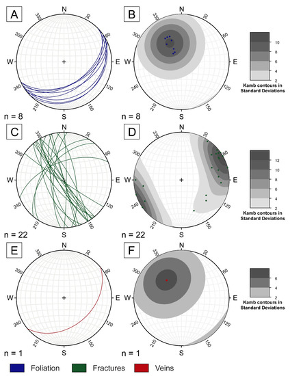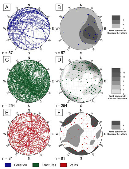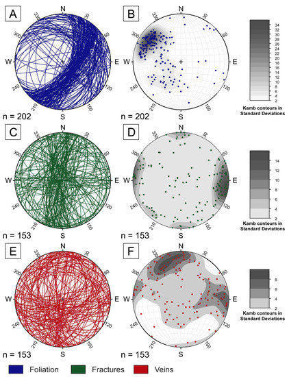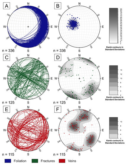 Planar and polar (pole-to-plane) plots with density contours of structures in the Glacier Creek area (field and drillhole data). (A,B) foliation; (C,D) fractures; (E,F) veins.