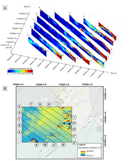 3D magnetic susceptibility data. (A) Fence diagram of cross-sections through the 3D magnetic susceptibility data. (B) Map showing the locations of the cross-sections in (A) that are overlaid on the total magnetic intensity map on which the 3D inversion was conducted.