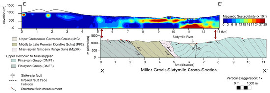 Comparison between the magnetic susceptibility cross-section E-E′ and the Miller Creek-Sixtymile River cross-section.