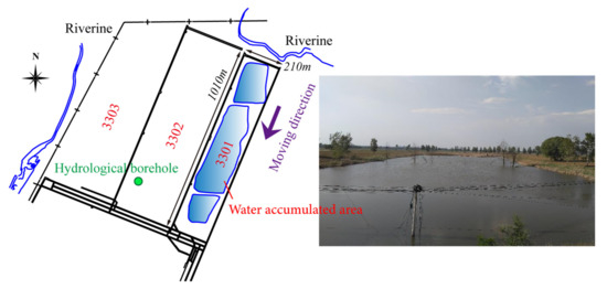 According to the feedback from the hydrogeological borehole, the sandstone aquifer at the roof of No. 3 coal seam, consisting mainly of medium- and fine-grained sandstone, is a direct water-filled aquifer of No. 3 coal seam with weak water-richness. The bedrock has multiple aquifers with medium water richness, which is the main source of water supply for the coal seam mining face. The Quaternary loose layers are fully covered, with a layer thickness of 166.7–206.0 m, and the formation occurrence is generally less than 8. Its aquifer is mainly composed of yellow, brownish-yellow powder-coarse sand, gravel layer, etc., which constitutes a lens body of different sizes. The water content and permeability are determined by the degree of development in the thickness of sand and gravel layers, which are generally moderately rich in water. The medium-grained sand layer near the surface is a submerged aquifer with high water-richness and large water storage capacity. In the low-lying areas of the region, shallow groundwater is naturally exposed and forms surface ponds (Figure 1).