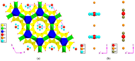- Andersoon, L.O. The position of H+, Li+ and Na+ impurities in beryl. Phys. Chem. Miner. 2006, 33, 403–416. [Google Scholar] [CrossRef]