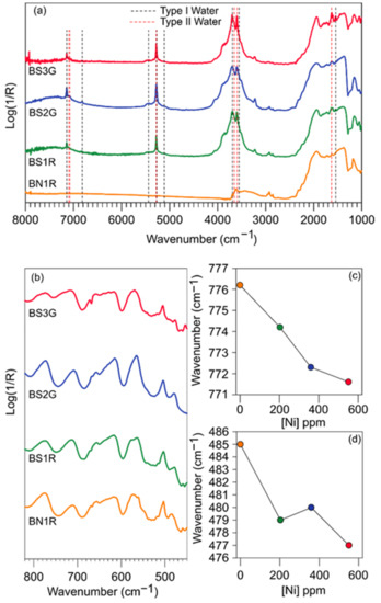 (a,b) Infrared spectra, in the 8000–400 cm−1 range, of the three synthetic (BS1R, BS2G, and BS3G) and of the natural (BN1R) red beryl samples. Positions of the modes ascribable to the “type I” and “type II” H2O molecules are marked by dashed black (I) and red (II) lines, respectively. (c,d) Shift of the Al-O and Be-O stretching modes (at about 485 cm−1 and 775 cm−1, respectively) as a function of the Ni content (see text for details).