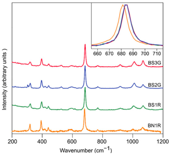 The Raman spectra of the four samples of this study are shown in Figure 4. The observed bands are in accordance with those reported in the literature [36,41]. The spectral region below 1500 cm−1 is characterized by crystal vibrations, including active Raman modes involving breathing of the six-membered rings, Si-O, Al-O, and Be-O bending and stretching. The main peak at about 680 cm−1 has been attributed either to an E1g or to an E2g mode [37,45]. According to these interpretations, this stretching mode involves the contribution of the relative motion of the tetrahedrally coordinated Be atoms and the octahedrally coordinated Al atoms, bonded to O atoms. However, the motion of the six-membered ring of SiO4 tetrahedra also partly contributes to this signal, as confirmed by ab initio calculation [41]. This peak is spectrally shifted toward lower wavenumbers in highly substituted beryls and/or in absence of molecular H2O in the channels [49]. Actually, natural samples from Utah, due to their unconventional magmatic origin, have both these features [50]. As expected, the main Raman peak of the sample BN1R lies at 681 cm−1, about 3 cm−1 less than those observed for the other synthetic samples (inset of Figure 4).