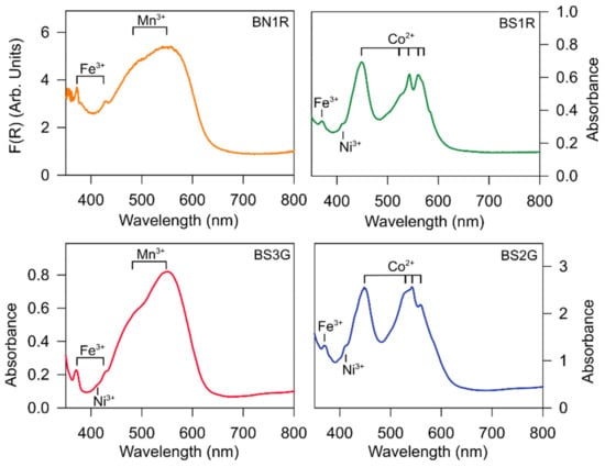 UV–visible diffuse optical absorption spectra were collected using a Perkin Elmer Lambda 950 spectrophotometer (PerkinElmer, Waltham, MA, USA) at the UniMIB, equipped with a 60 mm integrating sphere coated with Spectralon. BN1R spectrum has been collected in reflection mode, and reflection data have been transformed according to the Kubelka–Munk law and plotted as F(R) = (1 − R)2/2R (where R is the diffuse reflectance), with a resulting graphical representation comparable to the absorbance spectra. The UV–vis–NIR spectra are shown in Figure 5.
