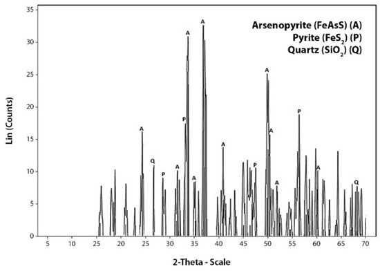 Additionally, to corroborate the aforementioned results, we performed an X-ray diffraction (XRD) to the same arsenopyrite pulp to estimate mineralogical composition. The diffractogram pattern evidenced the presence of arsenopyrite, pyrite and quartz as the main mineralogical species in the sample. The major proportion detected was for arsenopyrite with 38.9% followed by pyrite (24.4%) and quartz with a minor proportion of 5.5% (Figure 2).