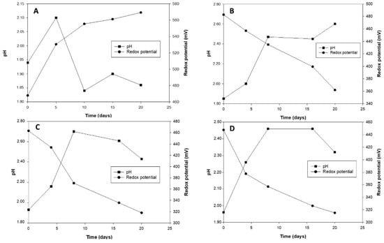 Bio-oxidation of arsenopyrite by A. ferrivorans ACH cells in presence of 1% (A), 5% (B), 10% (C) and 12% (D) arsenopyrite pulp at mesophilic condition.