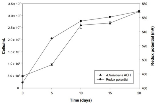 The principal microorganisms involved in arsenopyrite dissolution are acidophilic, iron and/or sulfur oxidizing and capable of resisting high arsenic concentration in solution [29]. In this context, here we reported for the first time the capacity of Acidithiobacillus ferrivorans to use arsenopyrite concentrate as energy source under mesophilic conditions. However, previous studies have described this species as a psychrotolerant, able to oxidize iron, sulfur, and reduced inorganic sulfur compounds, and to solubilize pyrite as energy source [18,19,24]. Moreover, the capacity to grow using arsenopyrite as unique energy source by ACH strain is evidenced in Figure 4, where the increase in bacterial cellular density is one order of magnitude after 20 days of incubation. In addition, the increased redox potential was concomitant with the proliferation of cell number detected in our assays (Figure 4). Therefore, it can be suggested that bacteria promote an active oxidation of the arsenopyrite concentrate reported previously in some group of archaea such as Sulfobacillus and Acidianus. In the particular case of the Acidithiobacillus genus, previous reports determined the capacities of arsenic resistance, specifically in some A. ferrooxidans strain grown in the presence of arsenopyrite [32,33], suggesting that this genus is tolerant to arsenic. In addition, mixed mesophilic adapted culture (enriched in A. caldus and L. ferriphilum) have shown high tolerance to arsenic in packed-bed columns and continuous bioleaching reactors of arsenopyrite from mine tailings [34,35].