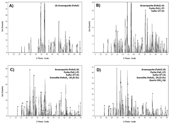 Similarly, the XRD pattern suggests that after 5 days of incubation arsenopyrite was the predominant solid, without any significant change in the mineral matrix (Figure 6A), despite the fact that an increase in the redox potential values was detected at this period of time (Figure 4). Subsequently, after 10 days of incubation, the XRD pattern showed changes in the pulp mineral species, detecting arsenopyrite, elemental sulfur and pyrite (Figure 6B). Interestingly, after 15 days of incubation, the XRD patterns revealed the presence of bioscorodite (FeAsO4 2H2O), in addition to arsenopyrite, pyrite, elemental sulfur and quartz (Figure 6C). Therefore, the bioscorodite precipitated is produced due to the bacterium ability to oxidize both iron and arsenic contained in the arsenopyrite, generating a stable precipitate which is rich in both elements. Finally, after 20 incubation days, the XRD result show that scorodite is one predominant mineral species in the culture, produced under mesophilic conditions (Figure 6D).