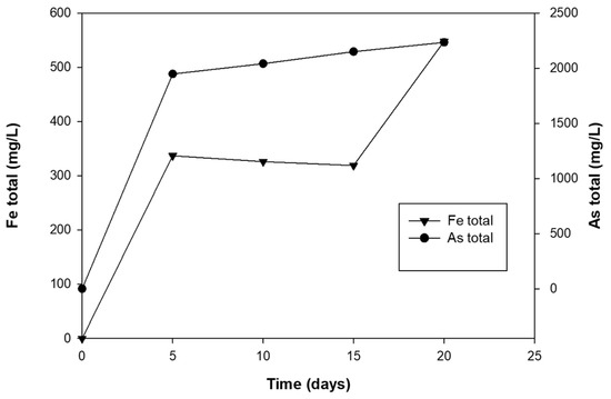Finally, we determined the As and Fe concentrations in solution after the arsenopyrite bio-oxidation assays (Figure 7). We observed an increase in total Fe and As concentration over time, both concomitant with the grow of A. ferrivorans ACH showed previously (Figure 4). This potential means that the ACH strain is capable of tolerating higher concentrations of arsenic; however, the respective tolerance tests, as determined by Minimal Inhibitory Concentrations (MIC), are pending a future study.