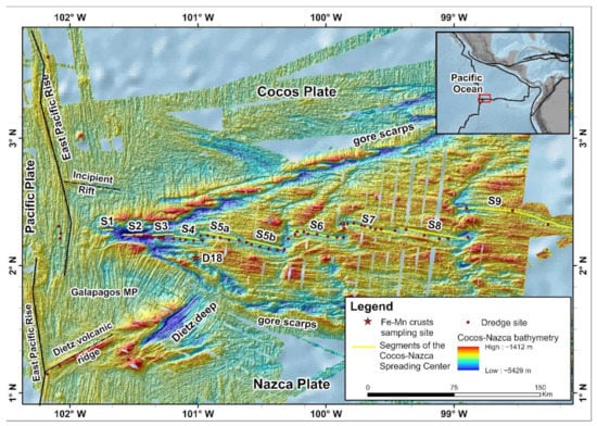 Location of the Fe-Mn crusts sampling site (D18) within the Cocos-Nazca Spreading Centre. Segments described in the text are marked from s1 to s9. Bathymetric data after [60].