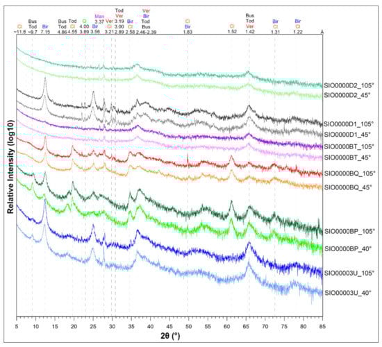 Bulk XRD data of dried (40 °C/24 h) and roasted (105 °C/24 h) crust samples from C-NSC: Bir—birnessite, Tod—todorokite, Bus—buserite, Ver—vernadite, Cl—clays, Man—manganite, Q—quartz. Peak positions (d-spacing) of identified minerals shown with different colors. Presence of a low number of collapsed manganates identified based on decrease of ~9.7 Å peak during roasting and simultaneous increase of ~7 Å peak. Traces of clay minerals are mostly characteristic of montmorillonite group. Traces of relatively pure Mn-oxyhydroxides (manganite) were observed in two samples (see Table 2).