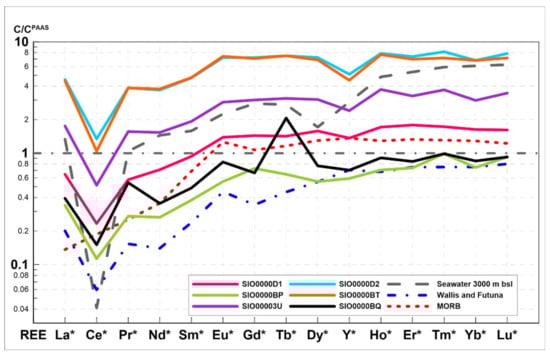 The PAAS-normalized REE distribution in Fe-Mn crusts from C-NSC (PAAS according to [63]). Seawater 3000 m bsl [74], Wallis and Futuna [75], MORB [76]. * normalized values of REE.