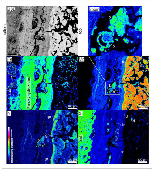 The representative EPMA mapping of thin SIO0000D1 crust sample (substrate-colloforms transition zone). Crust bottom and top indicated by BSE photography. Visible remnants of substrate and well developed alteration layer composed of Fe-dominated oxyhydroxides in ‘iddingsite’. Middle part of Mn image (white rectangle) shows rounded biogenic remnants covered by thin layer of Mn-oxyhydroxides: sub—substrate remnants, d—debris (mostly Fe-Ti oxides and silicates), b—biogenic and biomorphic features, tr—transitional zone/layer, gr—growth direction based on visible Ni dispersion.