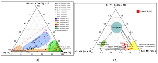 C-NSC Fe-Mn crust samples are studied in order to determine mineralogy, geochemistry and genetic processes. The geochemical and mineralogical results listed above show mixed conditions of formation. Traditional ternary Mn vs. Fe vs. (Cu + Ni + Co) × 10 diagram [16] shows that analyzed bulk samples represent complex features dominated by a various hydrogenetic-hydrothermal processes (samples SIO0000D2, SIO0000BT and SIO0000BQ), as well some diagenetic influences potentially related to transformation processes that occur between birnessite and todorokite (SIO0000D1 and SIO00003U). Sample SIO0000BP shows the strongest hydrothermal signatures among analyzed material (Figure 8a).