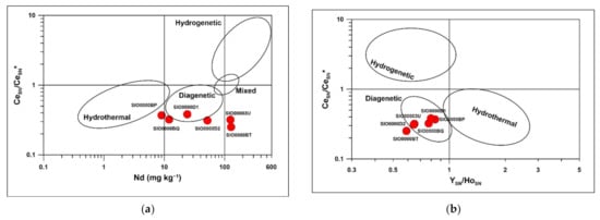 Discrimination diagrams of Mn-Fe crusts from C-NSC: (a) CeSN/CeSN* ratio vs. Nd concentration; (b) CeSN/CeSN* ratio vs. YSN/HoSN ratio [72]. SN = PAAS-normalized REE.