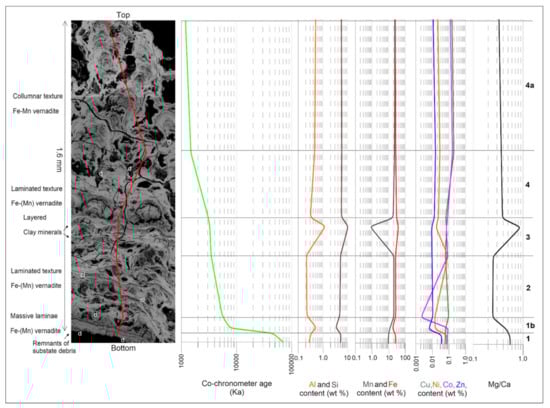 The Co-chronometer was applied to estimate growth rate (GR) and age of analyzed Fe-Mn crusts [72]. GR was calculated for bulk samples with the equation: GR = 6.8 × 10−1/(Con)1.67 (mm/Myr), where: Con = Co × 50/Fe + Mn (all metal contents in wt %). This method is reliable for age estimation of young Fe-Mn crusts [20]; however, calculated GR should be considered a maximum as this does not include growth hiatuses. Additionally, we applied the “back stripping method” in conjunction with Co-chronometer data, for age estimation of sample SIO000D2 [73]. Total crust thickness and metal contents were measured directly using EPMA for each colloform group in the sample, then the age of each divided textural type was estimated.